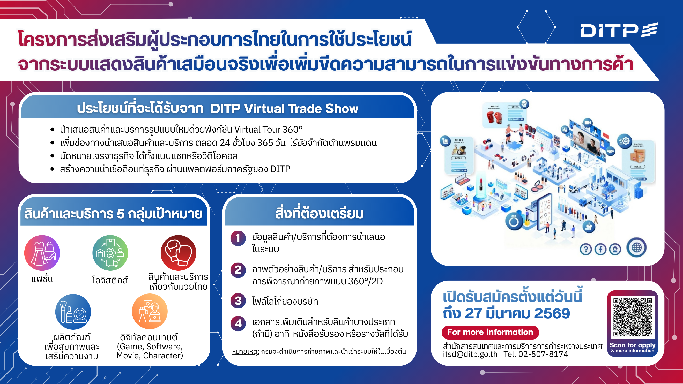 ลงทะเบียนเข้าร่วมการประชุม : ชี้แจงแนวทางการดำเนินโครงการส่งเสริมผู้ประกอบการไทย ในการใช้ประโยชน์จากระบบแสดงสินค้าเสมือนจริง